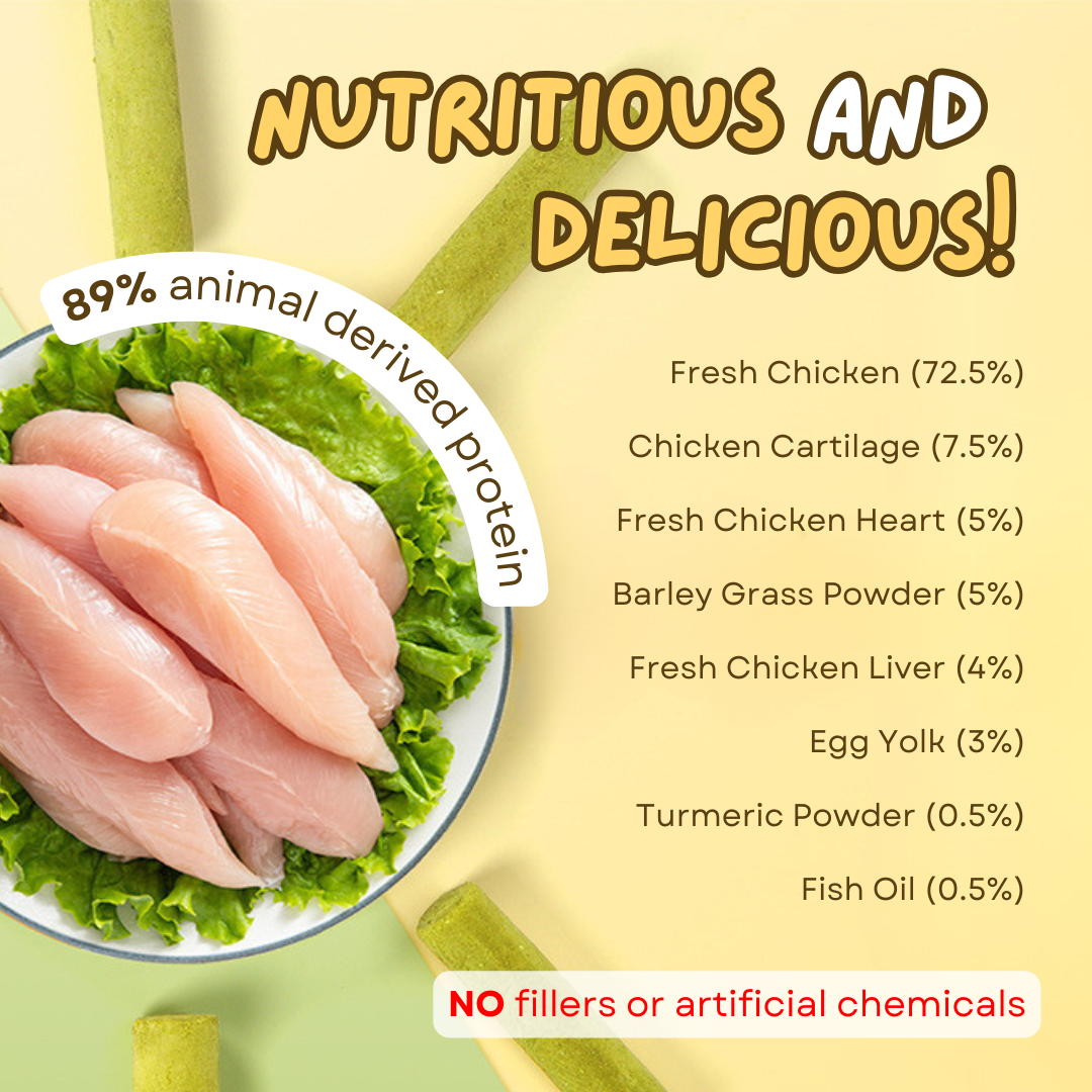 We did not compromise with the ingredients with this one, because we promise that every stick is full of mostly chicken and tons of cat grass with no fillers or artificial chemicals!